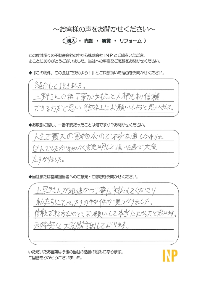 上野さんが迅速かつ丁寧に対応してくださり私たちにぴったりの物件が見つかりました。