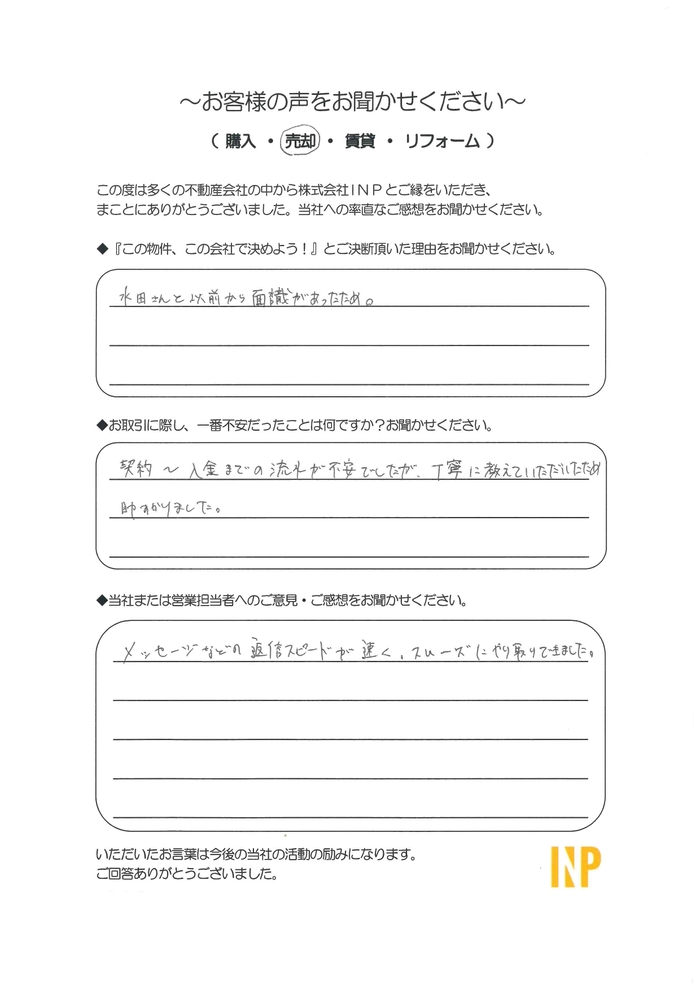 契約~入金までの流れが不安でしたが、丁寧に教えていただいたため助かりました。