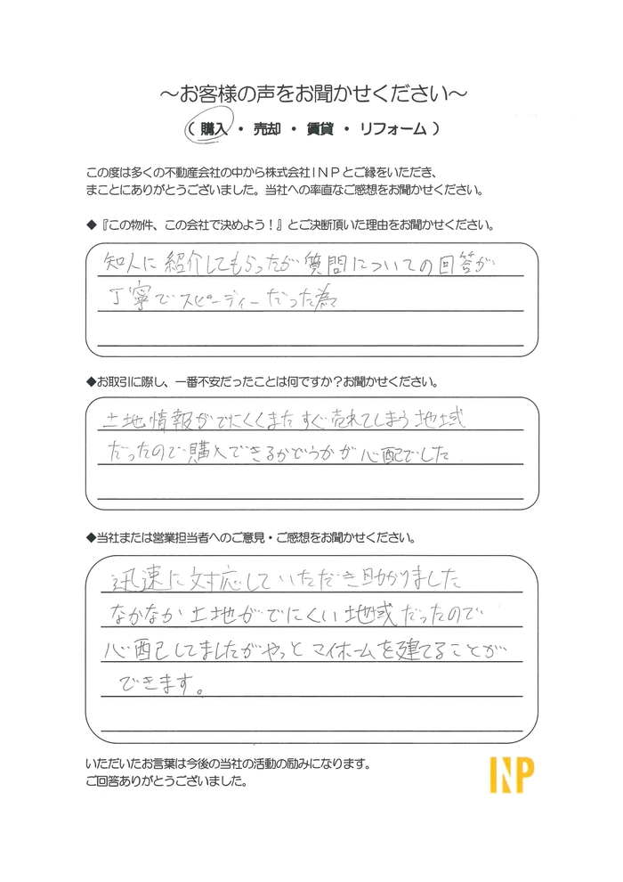 土地情報がでにくく、またすぐ売れてしまう地域だったので購入できるかどうかが心配でした。