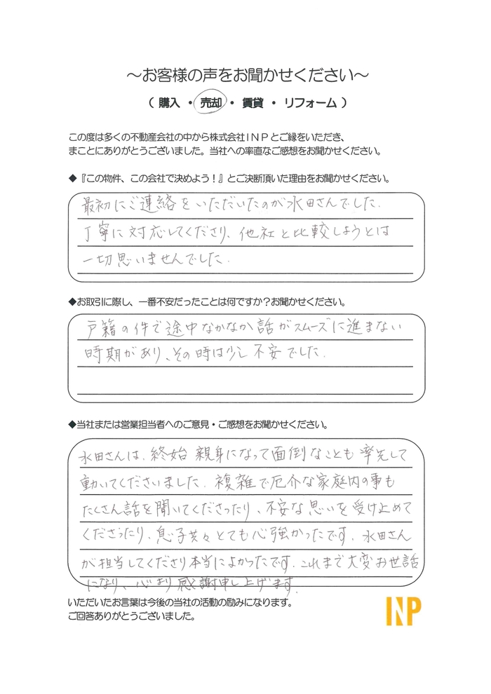 丁寧に対応してくださり、他社と比較しようとは一切思いませんでした。