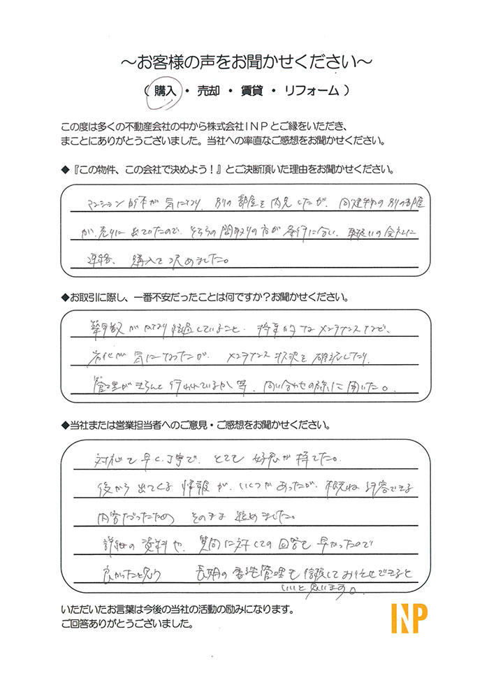 マンション自体が気になり別の部屋を内見したが、同建物の別の部屋が売りに出ていたので、そちらの間取りの方が条件に合い、取扱いの会社に連絡、購入を決めました。