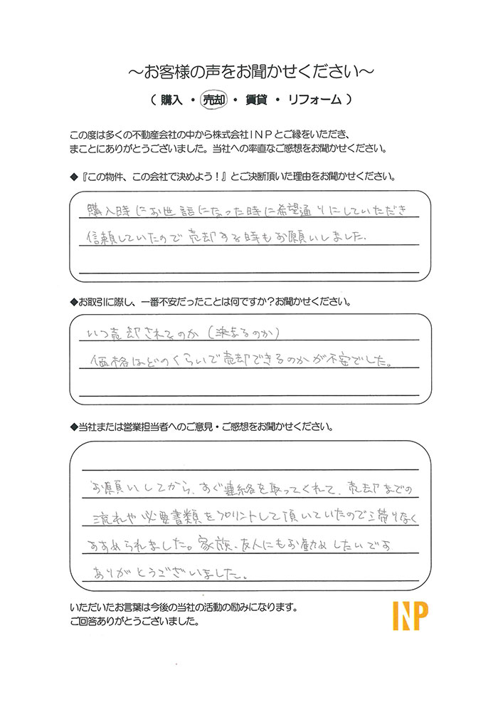 購入時にお世話になった時に希望通りにしていただき信頼していたので売却する時もお願いしました。