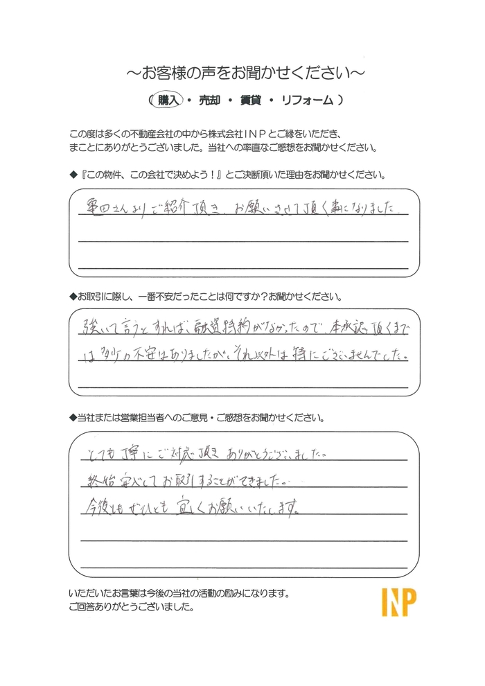 強いて言うとすれば、融資特約がなかったので、本承認頂くまでは多少の不安はありましたが、それ以外は特にございませんでした。